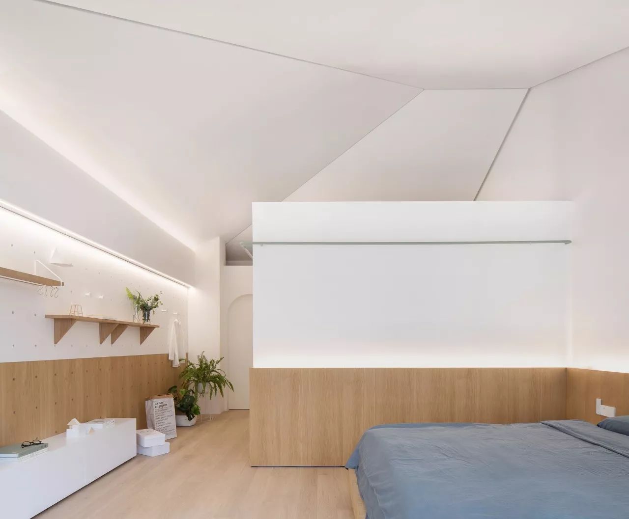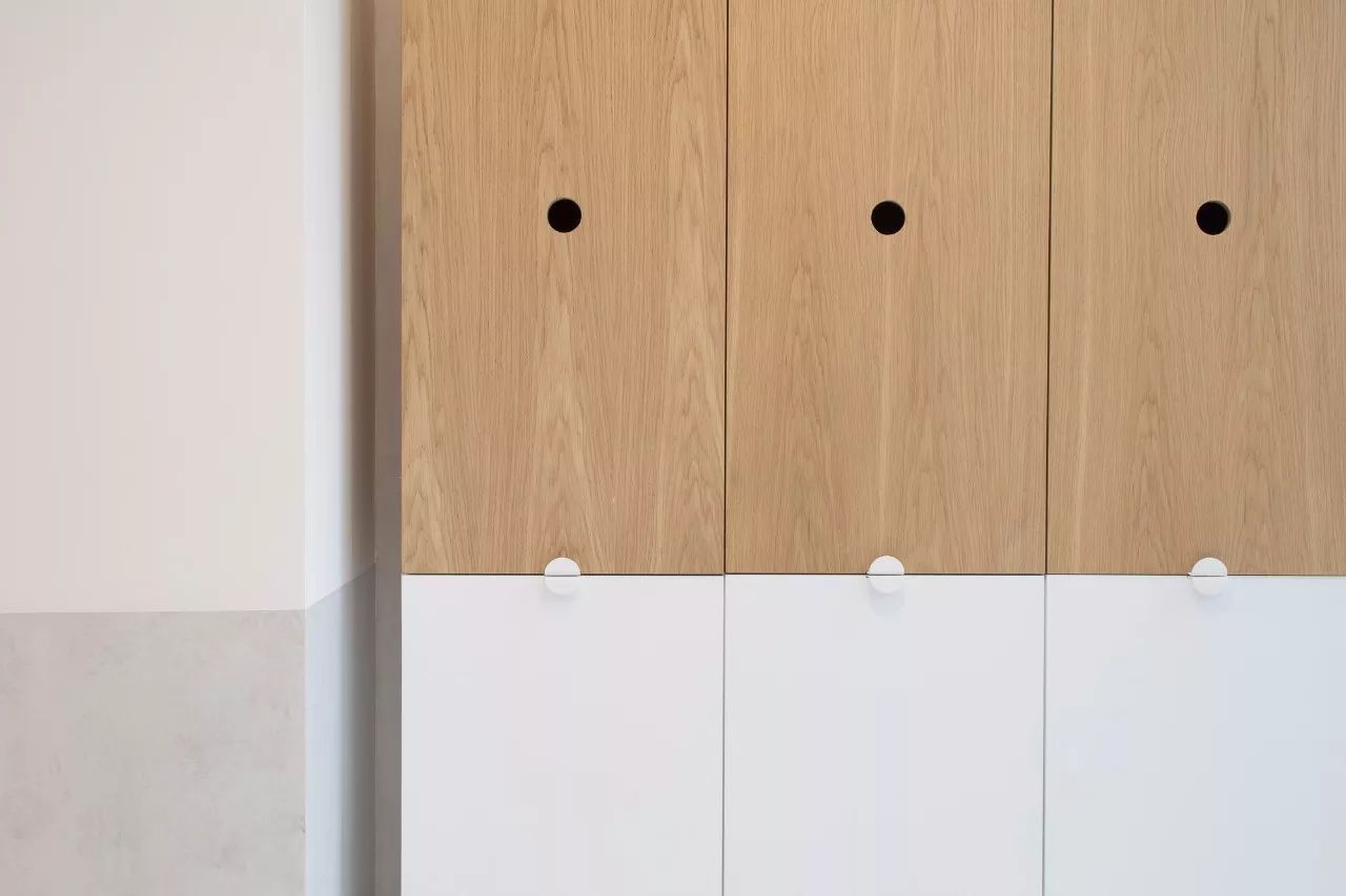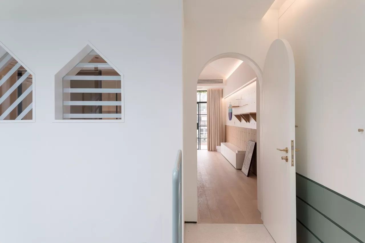 二樓設(shè)計中將門和儲藏空間隱藏在墻面中,創(chuàng)造了一個干凈且完整的區(qū)域,在陽光充足的時候,這是一個很溫暖的屬于家的空間。