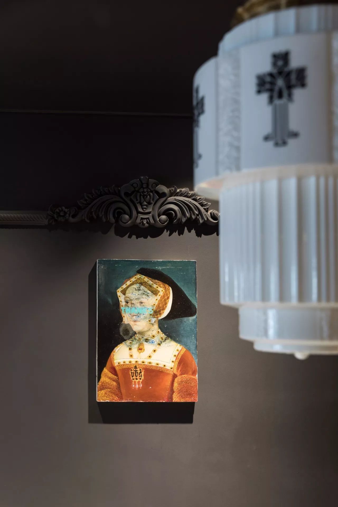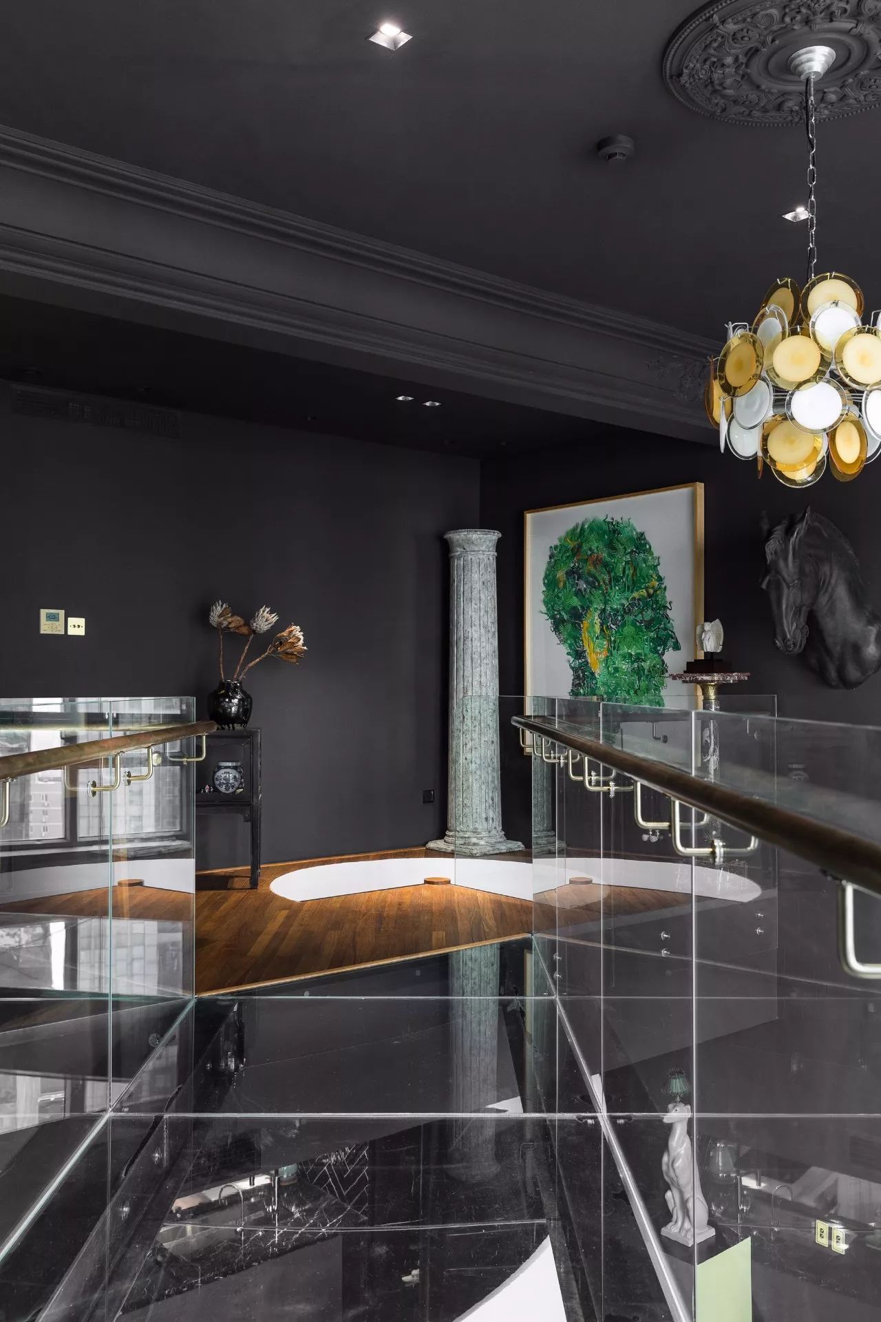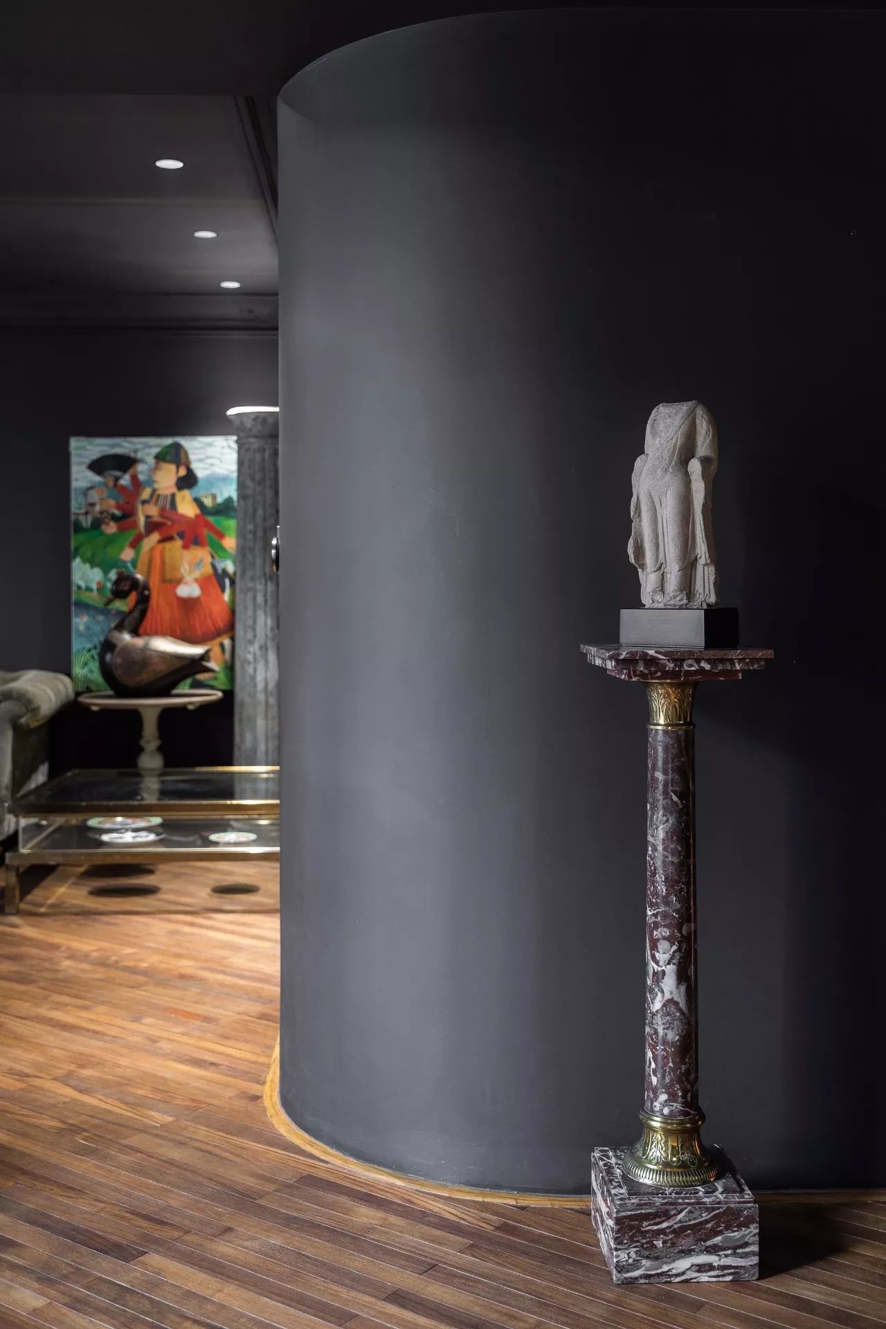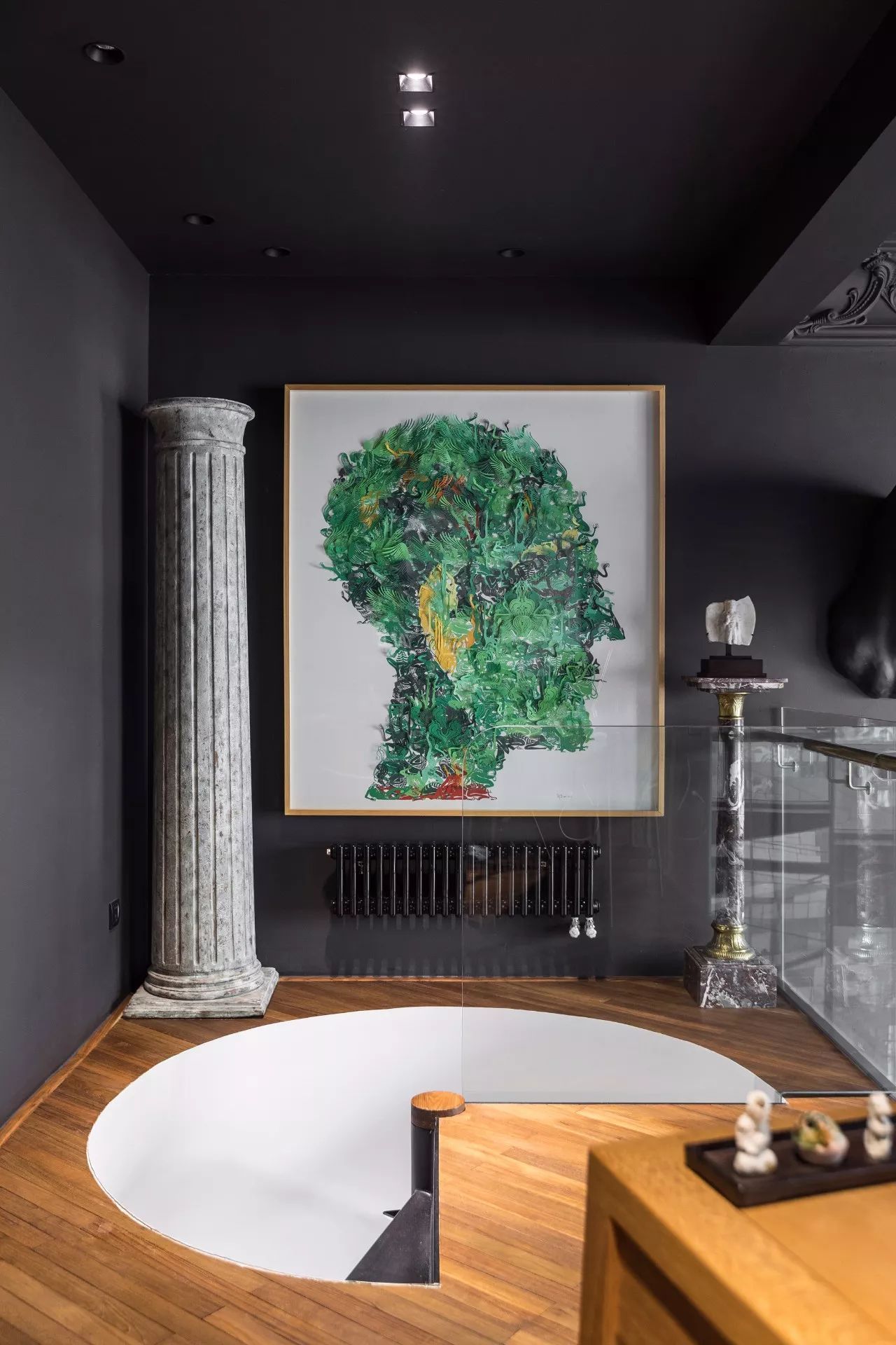 青年藝術(shù)家鄔建安的作品《睜眼閉眼》,搭配柚木老地板的厚重質(zhì)感,左側(cè)的舊羅馬柱拆自主人上一套房子。