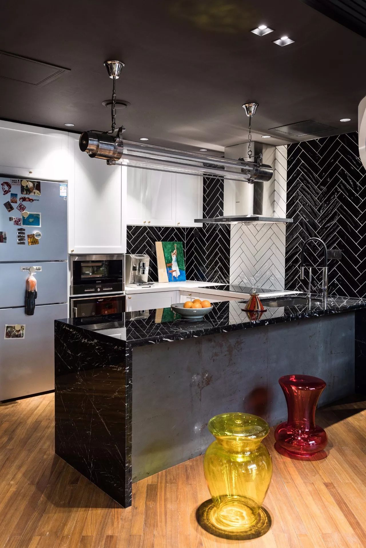 黑色的大理石臺(tái)面配上kartell的彩色凳子,形成一個(gè)寬大的吧臺(tái),一盞美式復(fù)古的吊燈格外搶眼,吧臺(tái)底部用鐵板制成,等待時(shí)光的銹蝕。