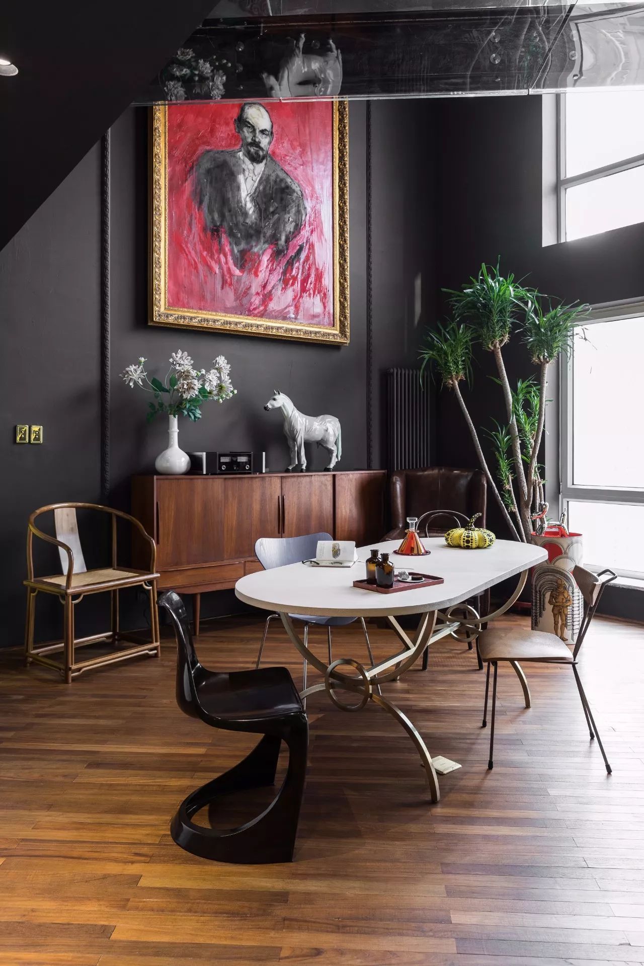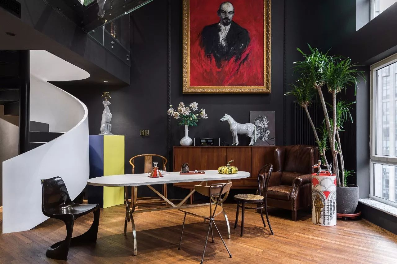 一層的挑高空間,藝術(shù)家秦鈴森的巨幅畫作《列寧》置于正中,顯得很有氣勢(shì)。下面是刁偉的雕塑作品《西裝馬》。一個(gè)玫瑰木的北歐古董邊柜和棕色沙發(fā)為整個(gè)空間帶來了溫馨的感覺。