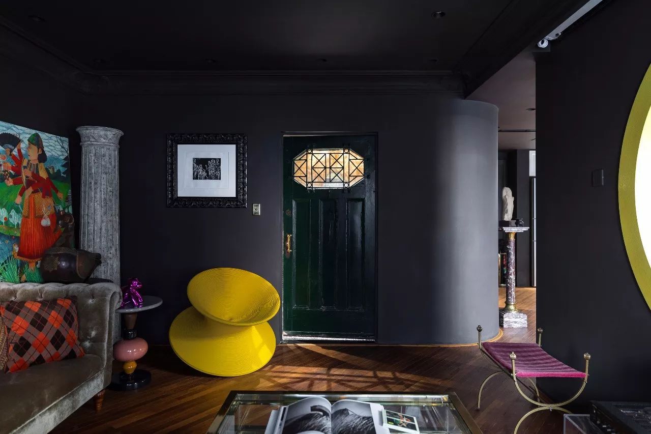 設(shè)計(jì)師在顏色的運(yùn)用上給了他們極大的驚喜,大面積的黑色并沒有感到壓抑,飽和度極高的藍(lán)色、綠色、黃色和紅色點(diǎn)綴著空間,和主人夫婦最喜歡的英國(guó)藝術(shù)大衛(wèi)·霍克尼(David Hockney)的擅長(zhǎng)的色彩不謀而合。