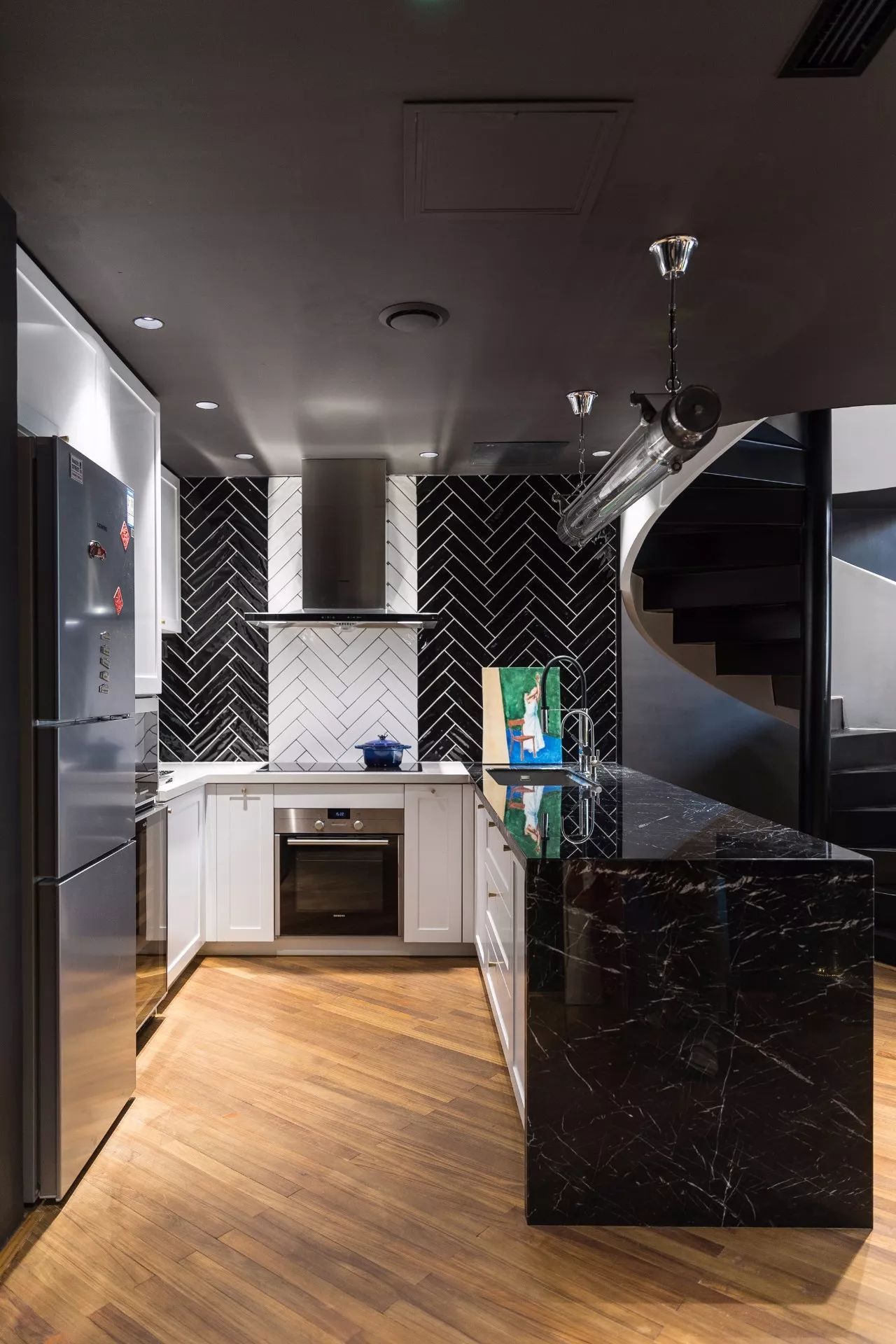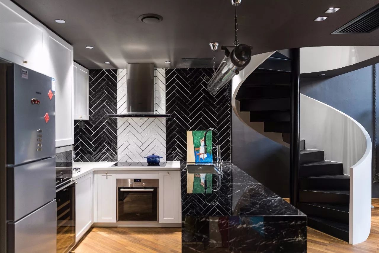 廚房和活動(dòng)區(qū)并置在一個(gè)開放空間,弱化了空間的界限。墻面采用黑白亮面手工磚鋪貼,復(fù)古又現(xiàn)代。