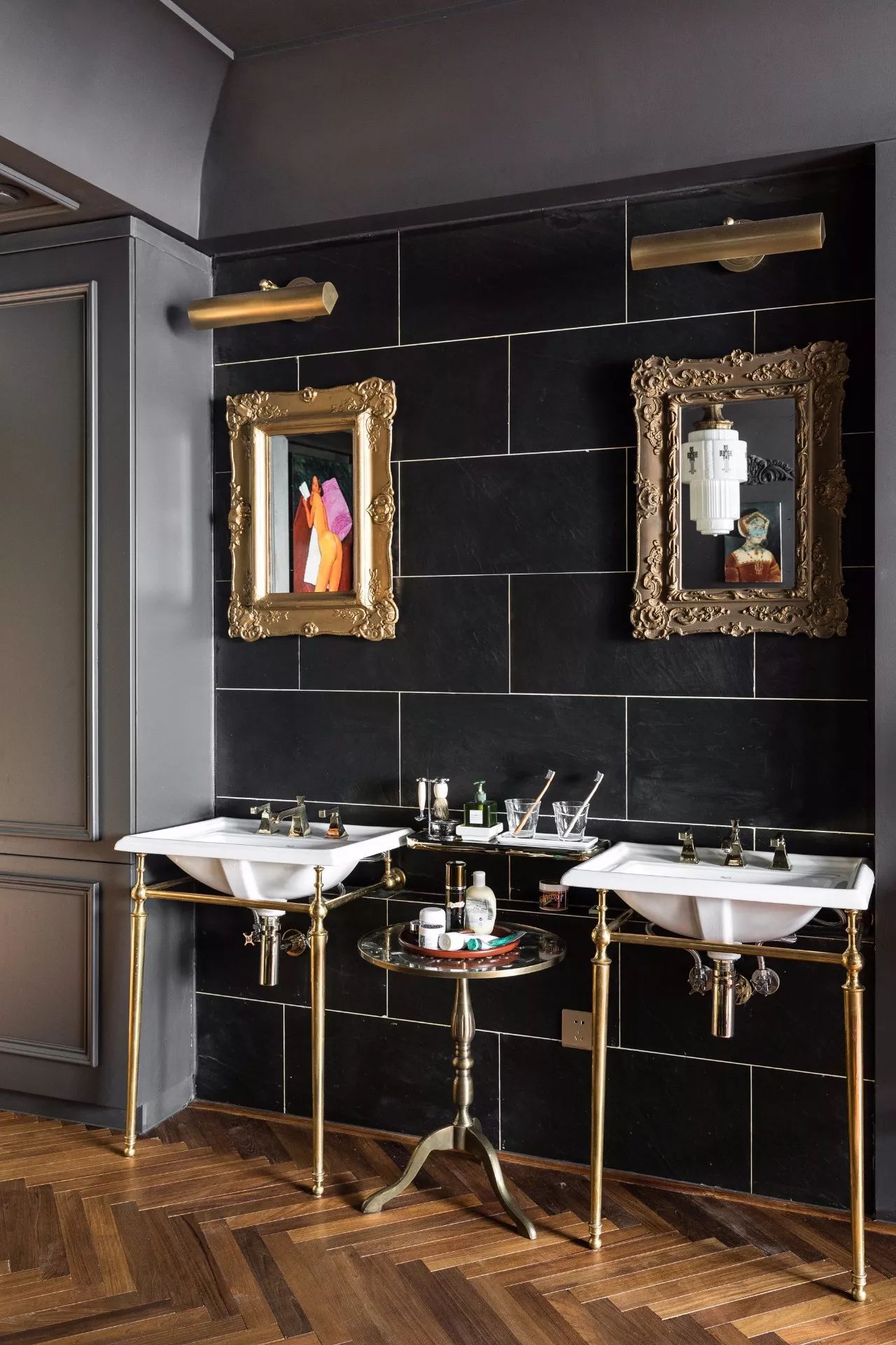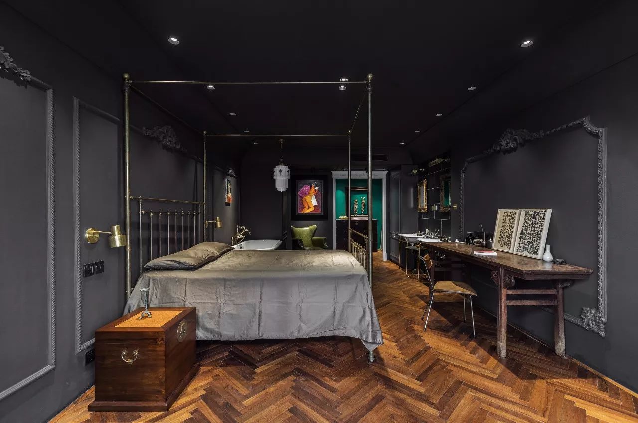 靜謐的炭黑色墻面,古董床和復(fù)古浴缸,暖暖的燈光,床頭燈來自設(shè)計(jì)師品牌《年輪公園》