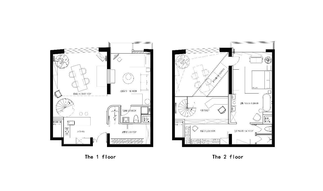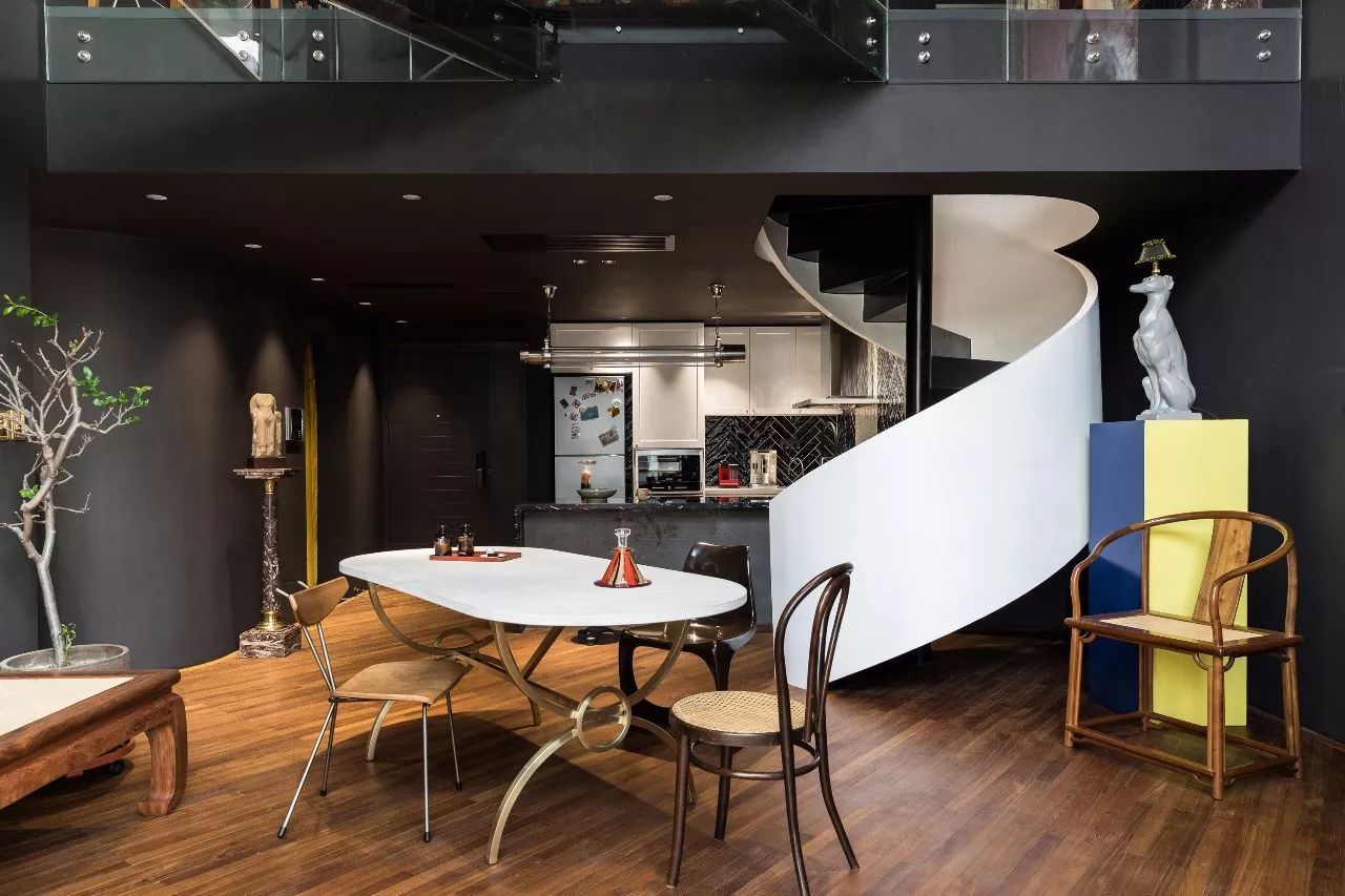 最大的驚喜來自頭上這架騰空而過的透明玻璃天橋,營(yíng)造出一種魔幻的穿越時(shí)空的感覺。一張集工作,會(huì)客,娛樂為一體的多功能餐桌占據(jù)了整個(gè)活動(dòng)區(qū),椅子則是業(yè)主的各式收藏。
