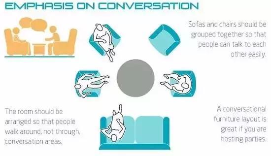 比如最長的一面墻可以成為焦點物件,沙發(fā)、座椅的朝向都轉向焦點物件形成一個弧形的對話空間。