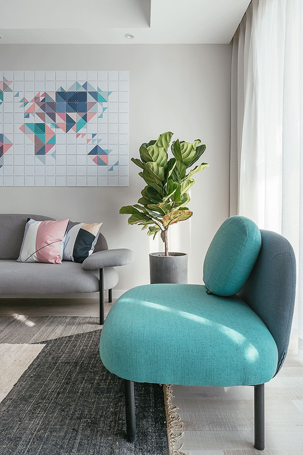 考慮到有小孩,設(shè)計師在建材選擇上非常注重環(huán)保性,結(jié)合風(fēng)格定位,選擇仿石材柔拋磚,糖果色小磚,實木木質(zhì)家具,棉麻窗簾等。