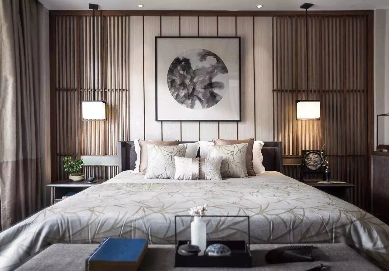 臥室背景墻采用細(xì)木條豎向分割,簡潔明朗的木質(zhì)格柵、時尚穩(wěn)重的家具以及暖色的燈光氛圍,使空間兼具溫馨舒適與典雅貴氣。