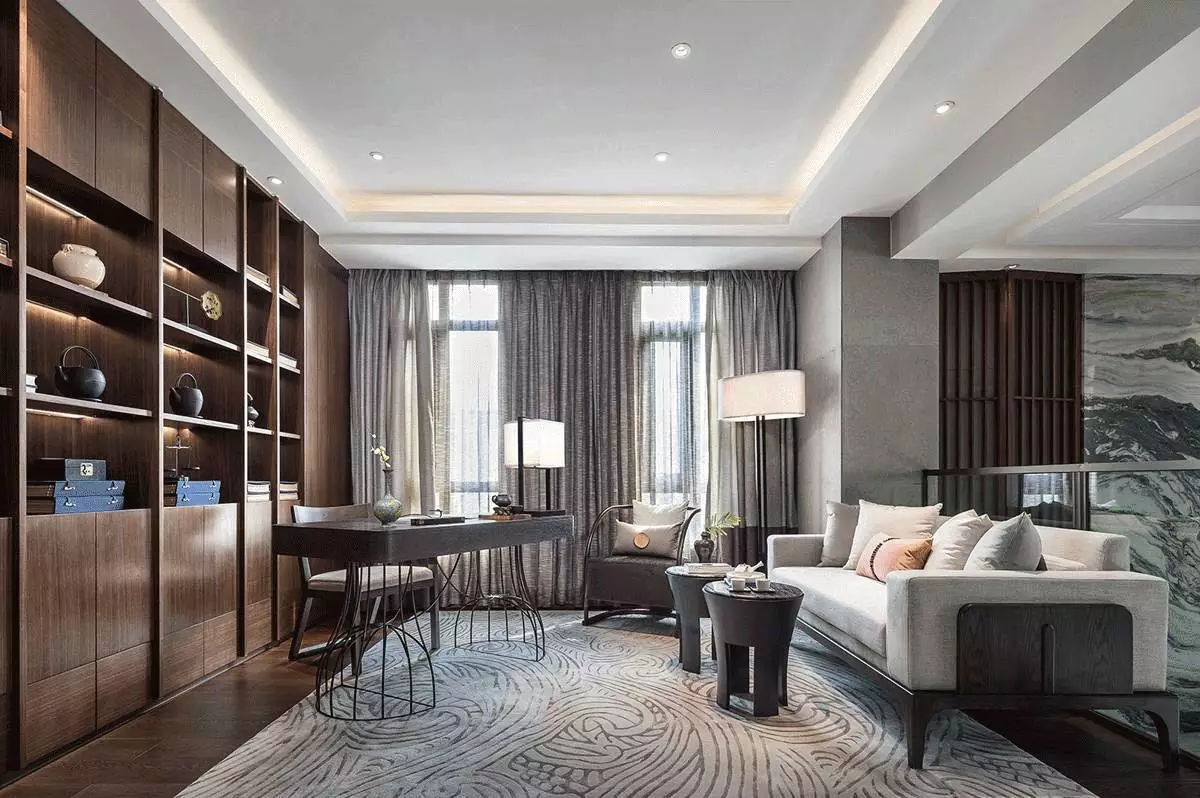 入口玄關(guān)的空間規(guī)劃恰到好處地實現(xiàn)了儲藏和展示的雙重功能。客廳整體設(shè)計極力呈現(xiàn)別墅空間雅致、安靜的力量。滿墻書架式設(shè)計作為立面極具震撼力的精神載體,搭配水墨掛畫讓整體空間大氣凝遠(yuǎn)、通達(dá)而有識鑒。