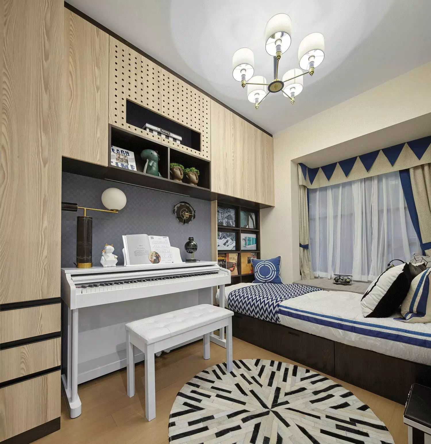 男孩房以寶藍(lán)色為基調(diào),從點(diǎn)到線到面的分布在房間的每個角落,白色的鋼琴,巧妙地與環(huán)境對話,藝術(shù)氛圍油然而生。