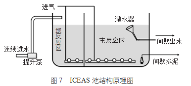 ICEAS工藝 ICEAS 即間歇式循環(huán)延時(shí)曝氣活性污泥法,與傳統(tǒng) SBR 相比,最大特點(diǎn)是:在反應(yīng)器進(jìn)水端設(shè)一個(gè)預(yù)反應(yīng)區(qū),整個(gè)處理過程連續(xù)進(jìn)水,間歇排水,其流程見圖 7。