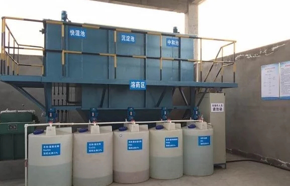 一級(jí)處理。鍍鉻廢水在破鉻反應(yīng)罐內(nèi)加酸及焦亞硫酸鈉對(duì)鉻還原,在酸性條件下,六價(jià)鉻與還原劑發(fā)生氧化還原反應(yīng),六價(jià)鉻被還原成三價(jià)鉻再進(jìn)入到中和反應(yīng)罐內(nèi)與機(jī)加工清洗水、鍍鎳、銅廢水加堿進(jìn)行中和反應(yīng),三價(jià)鉻、銅離子和鎳離子在堿性條件下生成金屬氫氧化物細(xì)小顆粒,在絮凝劑的作用下形成團(tuán)狀,加快沉降速度,減少沉淀時(shí)間。