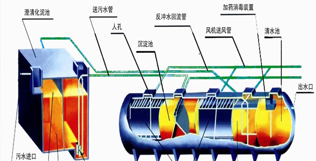 6、地埋式廢水處理設施根據(jù)需要在消毒池內加入消毒劑,二沉池來水經(jīng)過消毒劑加藥罐,藥劑部分溶解,達到消毒的目的。經(jīng)處理過的水在清水箱內停留約 0.5小時后,就達到了排放要求,可以向外界受水體排放。