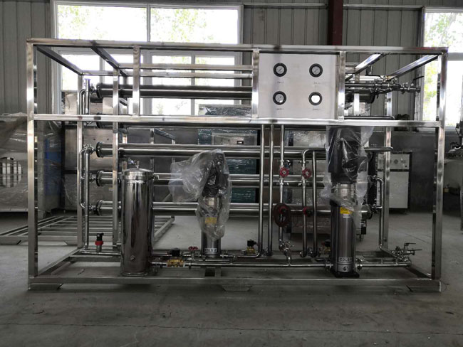 3、反滲透裝置主要包括多級(jí)高壓泵、反滲透膜元件、膜殼(壓力容器)、支架等組成。其主要作用是去除水中的雜質(zhì),使出水滿足使用要求。后處理系統(tǒng)是在反滲透不能滿足出水要求的情況下增加的配置。