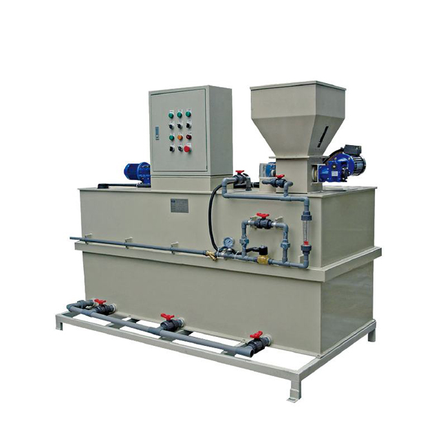 本裝置由供水系統(tǒng)、干粉投加系統(tǒng)、溶解熟化系統(tǒng)、控制系統(tǒng)、液體投加系統(tǒng)構(gòu)成。