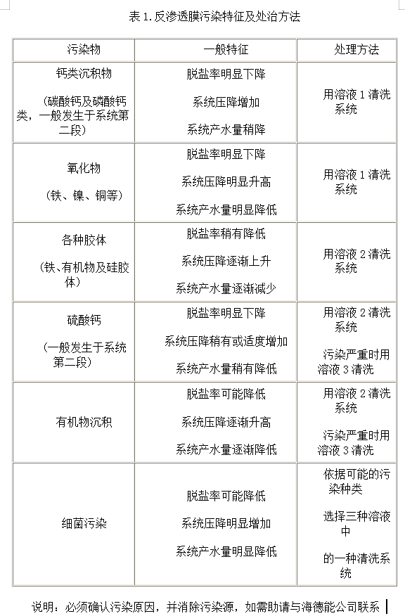 有機(jī)沉積物 ( 例如微生物粘泥或霉斑 ) 可以使用清洗液 3 去除,為了防止再繁殖,可使用經(jīng)海德能公司認(rèn)可的殺菌溶液在系統(tǒng)中循環(huán)、浸泡,一般需較長(zhǎng)時(shí)間浸泡才能有效,如反滲透裝置停用三天時(shí),最好采用消毒處理,請(qǐng)與海德能公司會(huì)商以確定適宜的殺菌劑。
