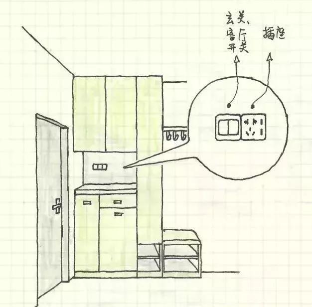 玄關+餐廳:進玄關處要設計兩個開關,分別打開玄關和客廳的照明燈,快出玄關的地方要再裝個開關,關閉玄關燈。