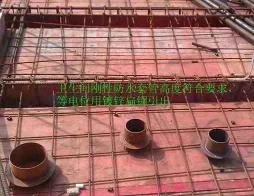 衛(wèi)生間剛性防水套管高度符合要求,等電位用鍍鋅扁鋼引出