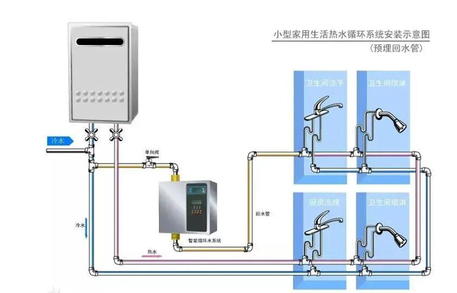 安裝回水系統(tǒng)時須提前安裝一套止回閥,回水系統(tǒng)工作時抽動管道內(nèi)的冷水(熱水管道內(nèi)的冷水這時會由止回閥流向冷水管道,冷水管道內(nèi)的水又流向熱水器,這樣就行程一個內(nèi)循環(huán))從而通過熱水器來進行加熱。機器工作時間可根據(jù)熱水管道長度來設定。回水管道,就是從熱水管的最遠段再接回一條水管到熱水器的下方,回來的這條水管就是我們常說的回水管。