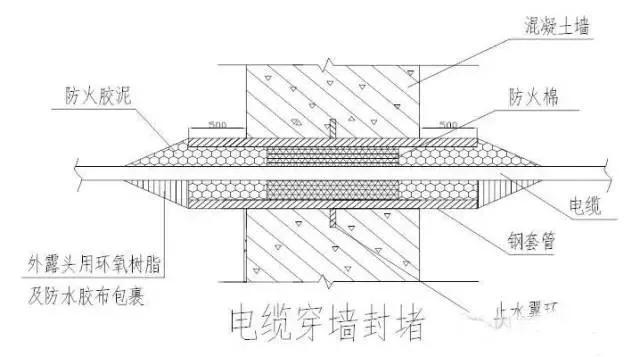 1)電纜直接穿過(guò)套管,應(yīng)先清除套管內(nèi)的雜物,鐵銹,并在管壁刷防銹漆,防銹漆干透之后才將電纜穿過(guò)套管,待電纜敷設(shè)完畢、固定好后方可經(jīng)行封堵工作。