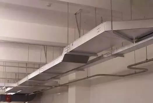 成排鍍鋅橋架進(jìn)入配電盤柜前的布置情況。
