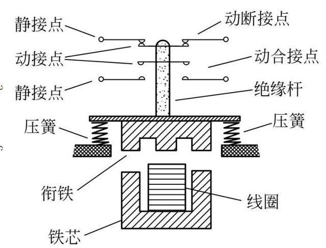 接觸器是利用電磁鐵原理工作的,結(jié)構(gòu)如下圖所示。當給線圈通以工作電流時,鐵芯產(chǎn)生電磁力將磁鐵吸下,帶動各觸點同步運動,控制負載電路工作。