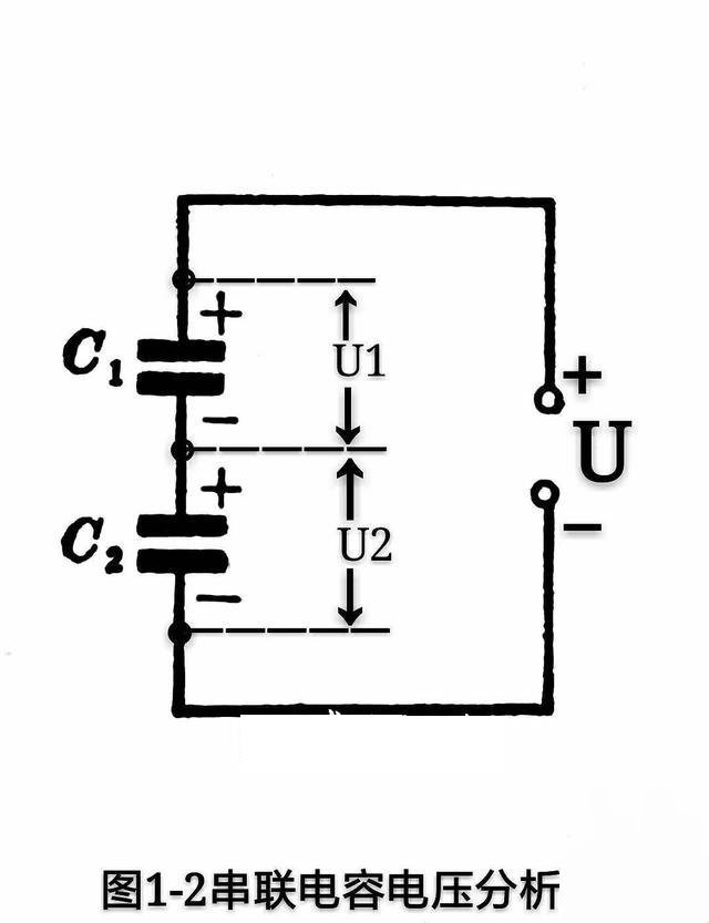 從圖1-2所示我們來分析直流電源電壓U=U1+U2,這里需要指出,即是標稱容量相同的電容器,它們之間也存在容量誤差,如果是不同容量的電容器串聯(lián), 那么它們之間的實際電壓值是有很大差別的。