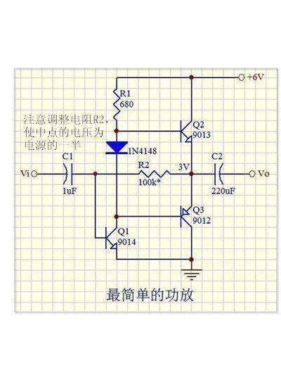下面,我們就按上圖,用三極管制作一個(gè)簡單的音響功放電路。來玩玩吧。