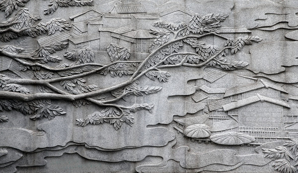 3、沉雕。又稱"線雕",即采用"水磨沉花"雕法的藝術(shù)品。此類雕法吸收中國畫與意、重疊、線條造型散點透視等傳統(tǒng)筆法,石料經(jīng)平面加工拋光后,描摹圖案文字,然后依圖刻上線條,以線條粗細深淺程度,利用陰影體現(xiàn)立體感。