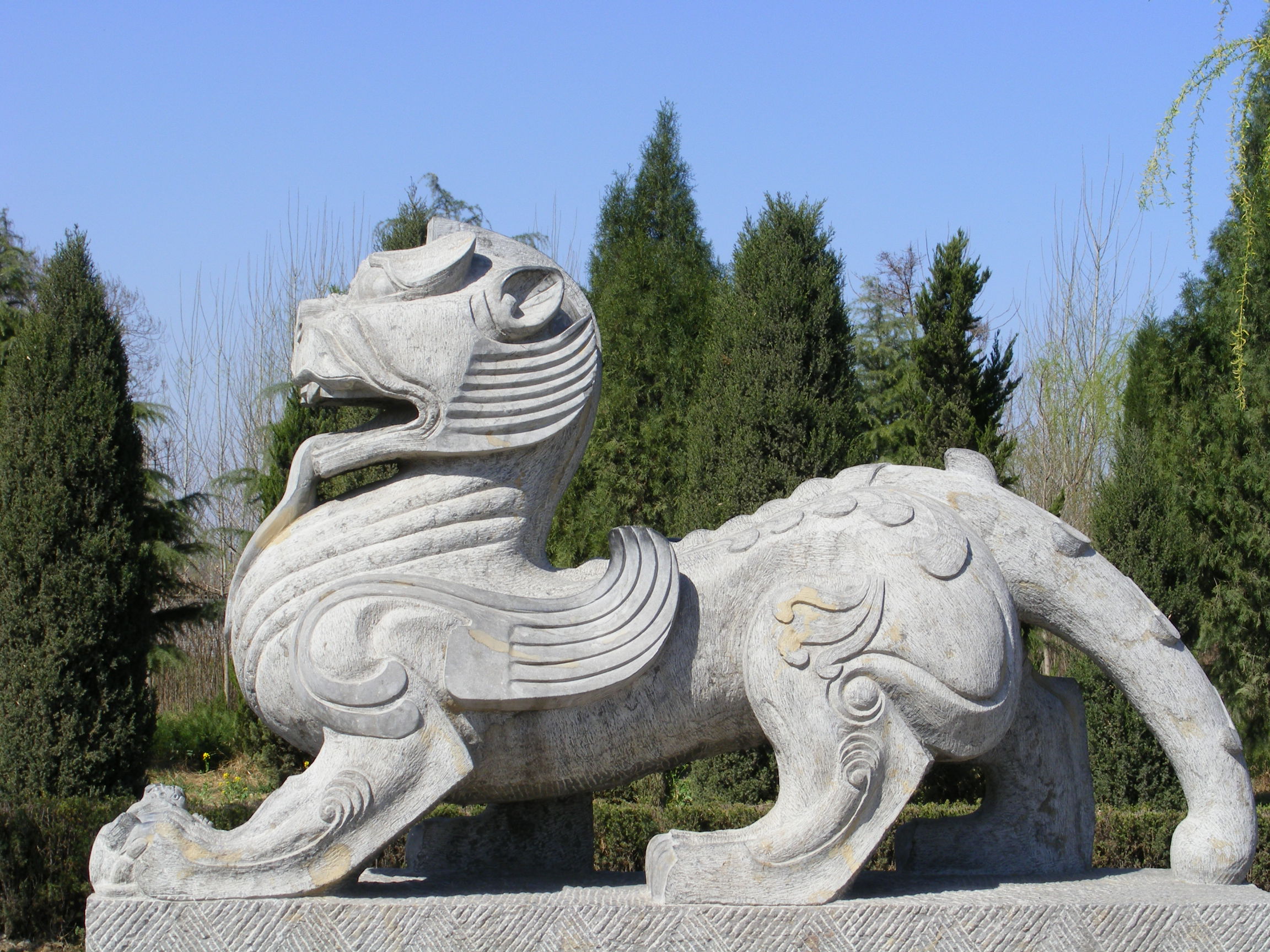 中國石獸雕刻中,石獅雕刻別具一格,制作量無計其數(shù),裝飾用途廣泛,如皇宮、宅院、官衙、廟字陵墓和現(xiàn)代的大型商廈、賓館、酒樓大門兩側(cè)的石獅雕刻和橋梁、碑、坊的石獅裝飾雕刻等。石獅體態(tài)造型變化多姿多樣,如站、蹲、臥等,千姿百態(tài),且常有地域性差異。