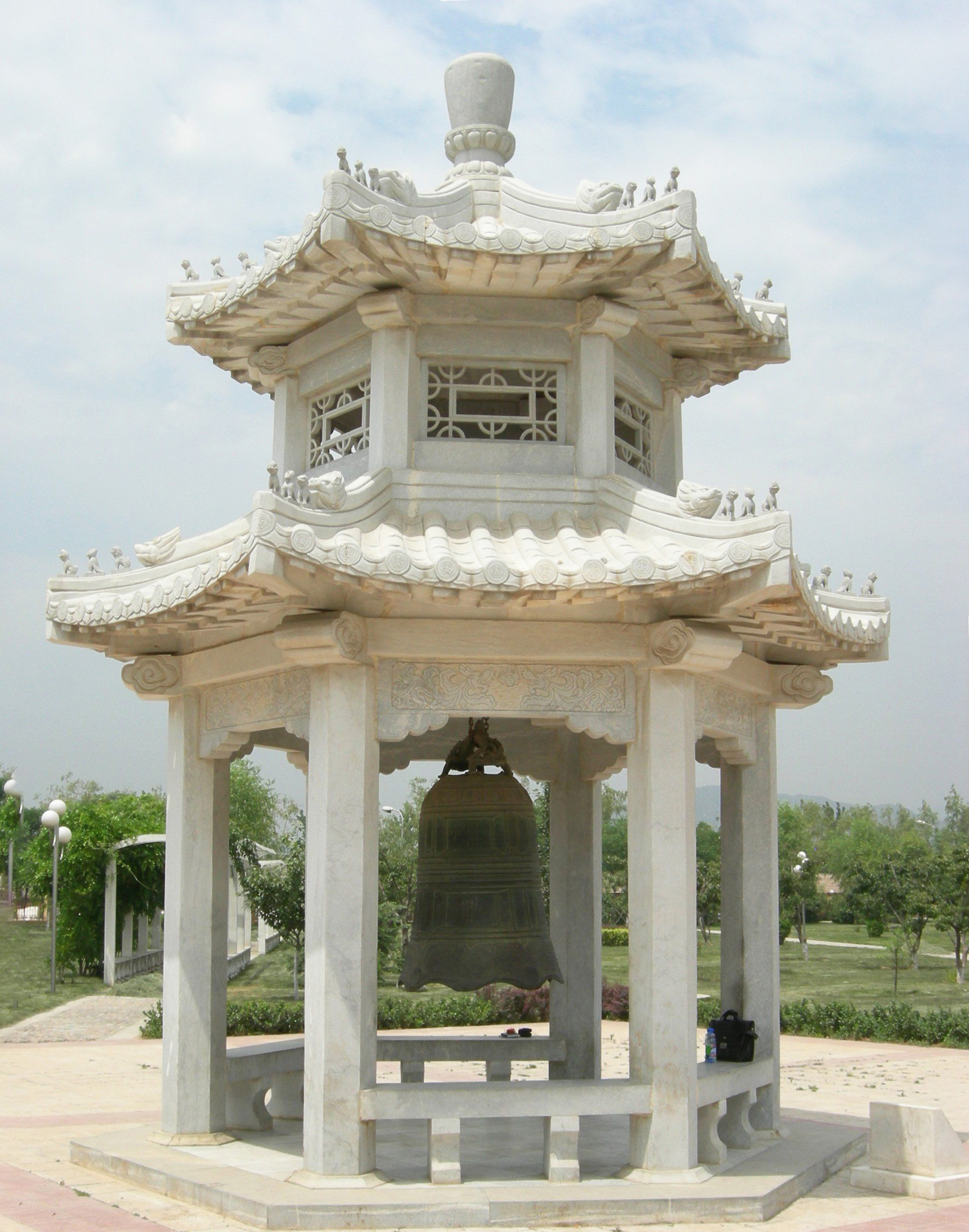 石涼亭的空間構(gòu)造可以是三維的立體形態(tài),也可以兼?zhèn)淠撤N平面形態(tài);既可以依附于某種載體,又可相對獨 立地存在。一般地說來,為適合特定視點的觀賞需要或裝飾需要,石雕涼亭相對圓雕的突出特征是經(jīng)形體壓縮處理后的二維或平面特性。