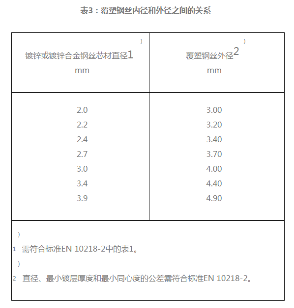 鍍鋅鋼絲或鍍鋅合金鋼絲的直徑公差應(yīng)如表1中所示,鍍鋅覆塑鋼絲或鍍鋅合金覆塑鋼絲的直徑公差必須如表3中所示。