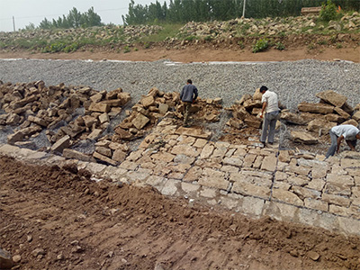 石材規(guī)格質(zhì)量必須符合設(shè)計(jì)要求; 嚴(yán)禁在單個(gè)網(wǎng)格中填充石材,石材必須均勻地填充到一組網(wǎng)格墊的每個(gè)網(wǎng)格中。填充石材可以一次填充高度,間隙用小碎石填充,應(yīng)采取適當(dāng)?shù)膿v固措施,以確保箱內(nèi)填充材料的密實(shí)度; 填充石的頂面應(yīng)適當(dāng)高于護(hù)墊;填充石的容重必須 ≥1.70t/m3 。