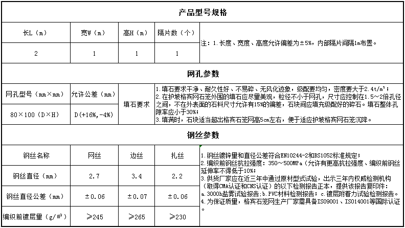 五、使用壽命:石籠網(wǎng)的編織鋼絲采用鍍鋅、PVC覆塑、鍍高爾凡,使用壽命長。據(jù)試驗(yàn),將涂層塑料在30%濃度酸溶液中浸泡10天,塑料無變色,無破裂現(xiàn)象.由此可見,即使在高污染地區(qū)使用石籠網(wǎng),耐腐蝕也是可靠的。護(hù)坡格賓石籠網(wǎng)規(guī)格參數(shù)