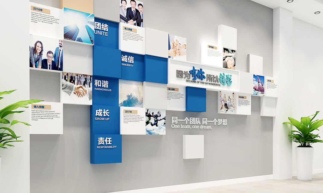 而在文案、圖片等內(nèi)容方面,同樣要做到縮減與取舍。可做可不做的內(nèi)容就不要做,必須要做的內(nèi)容才做。在使用文字展現(xiàn)方式和畫面布局時(shí),必須遵循簡明扼要的原則,省去一切繁瑣環(huán)節(jié),讓人一看就明白。由于文化墻的篇幅空間有限,這就需要設(shè)計(jì)者巧妙地利用文字排版做好整體布局。特別是在圖片比較多的情況下,比如用相框排列的形式制作文化墻,錯(cuò)落有致再配上簡單的文字排列,也是一種不錯(cuò)的風(fēng)格形式,可以讓人眼前一亮。