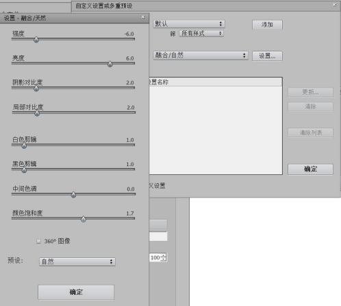 第六步,“自定義設(shè)置”調(diào)為“融合/自然”模式,點(diǎn)擊“設(shè)置”,調(diào)試“強(qiáng)度、亮度等數(shù)值”以增強(qiáng)合成后圖片的畫面色彩飽和度,設(shè)置參考如下圖: