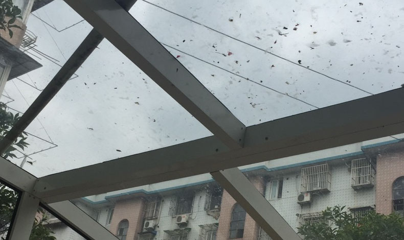 如果當初早點看到這個帖子,小編一定會給他推薦自動開合屋頂,不僅能起到遮風擋雨的作用,上面出現(xiàn)的問題也能輕松解決。自動開合屋頂不似上圖那樣是封閉的,而是一塊一塊的模塊,根據(jù)天氣情況或自己心情可以隨時開合,增強室內(nèi)外通風。而且它雖然看上去和玻璃一樣,實際卻是武警防爆盾的主要材料——聚碳酸酯板,透光率可與玻璃媲美,但不論是隔熱效果還是抗沖擊力都比玻璃強。表面有UV涂層,在隔離紫外線的同時還使得板材有一定的自潔性,不易沾染灰塵等,清潔時只需用高壓水槍沖洗就可以了,不會影響采光和美觀。