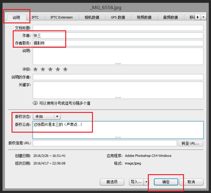 為了避免被盜圖,現(xiàn)在很多攝影師在發(fā)布作品前都會打上自己的水印。然而,水印不但會影響照片的美觀,甚至還可以被盜圖者輕易抹掉,所以水印這個東西看似可以起到保護版權(quán)的作用,但實則并沒有什么卵用。而保護版權(quán)的最好做法,是將版權(quán)信息嵌入到圖片本身的元數(shù)據(jù)里。在Photshop里如何將版權(quán)信息嵌入圖片里呢?步驟如下:按住Ctrl+Alt+Shift+I,或者點擊文件>文件簡介,就會彈出以下的元數(shù)據(jù)窗口。然后根據(jù)提示輸入你的信息,再點擊確定保存就可以了。