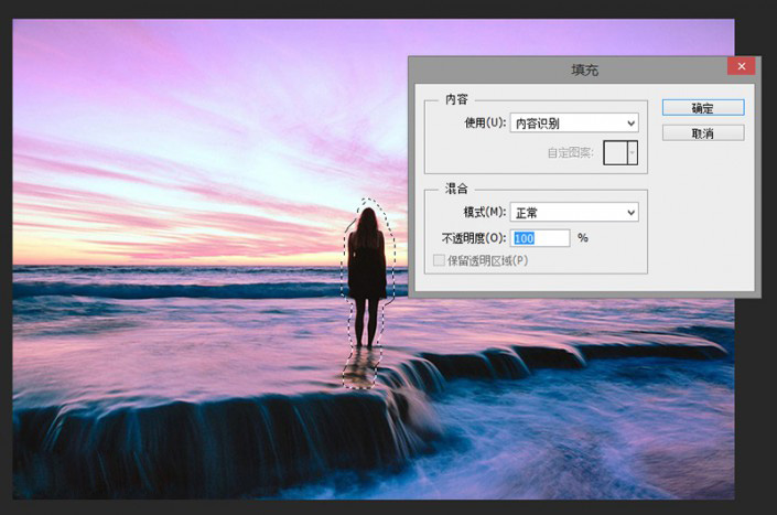 我們所知道的修補圖像方法有很多,如“仿制圖章”工具、“修補畫筆”工具等。但這一次我要給大家安利一個最簡單粗暴的工具,“內(nèi)容識別”工具。你只要在一張圖片上,圈選出你要修改的區(qū)域,然后點擊“內(nèi)容識別”,系統(tǒng)就會根據(jù)相關(guān)的像素來修復(fù)選中的區(qū)域。比如說我要把下圖中的女孩紙從畫面中除去,選中“套索”工具,對其做出一個選區(qū)。然后點擊編輯>填充>選中內(nèi)容識別>確定。
