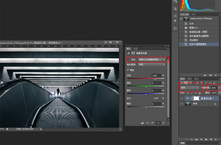 用“通道混合器”來增加圖片的明暗對比,是一種非常簡單的方法,但效果不錯。首先,創(chuàng)建一個“通道混合器”調(diào)整圖層,將它的預(yù)設(shè)改為“使用紅色濾鏡的黑白”,然后把圖層混合模式設(shè)為“柔光”,最后,通過調(diào)整圖層的不透明度來達到你想要得對比效果。