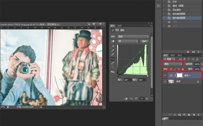 Photshop里有很多方法可以校正顏色,而你不妨試試用“曲線”去校正。首先,新建一個曲線調(diào)整層,將其圖層混合模式設(shè)置為“顏色”,這樣調(diào)整的話就不會影響你圖像的色調(diào)值。