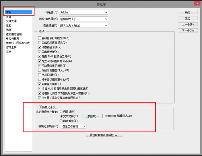 俗話說,好記憶不如爛筆頭。當(dāng)你在修一組人像圖的時候,為了圖像的統(tǒng)一性,往往修每一張圖的步驟大致要做到一樣。當(dāng)突然忘了步驟怎么辦?這時Photshop的“歷史文本”功能就派上用場了。它與“動作”功能不同,它的作用相當(dāng)于幫你做筆記,助你回憶起修圖的一些步驟和細節(jié)。點擊編輯>選項>常規(guī),就可以打開這個功能。