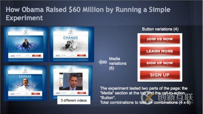 2008 年奧巴馬意在競(jìng)選美國(guó)總統(tǒng),當(dāng)時(shí)奧巴馬的線上營(yíng)銷(xiāo)策劃團(tuán)隊(duì)負(fù)責(zé)其競(jìng)選募捐網(wǎng)站。而網(wǎng)站最核心的目標(biāo)是:讓網(wǎng)站的訪客完成注冊(cè)并募捐競(jìng)選資金。這個(gè)奧巴馬的線上營(yíng)銷(xiāo)策劃團(tuán)隊(duì)當(dāng)時(shí)做了一個(gè)非常成功的實(shí)驗(yàn):通過(guò)對(duì)多個(gè)不同風(fēng)格的視頻文案以及底部button進(jìn)行多次ab測(cè)試。