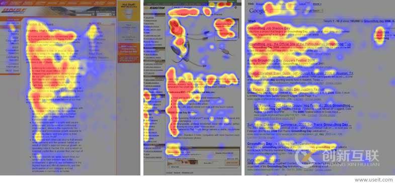 nngroup 的眼動跟蹤研究證明了這一點,紅色的部分是用戶感興趣的區(qū)域,黃色的區(qū)域次之,不感興趣的則為藍色的區(qū)域,灰色的區(qū)域是用戶直接忽略不作停留的部分。