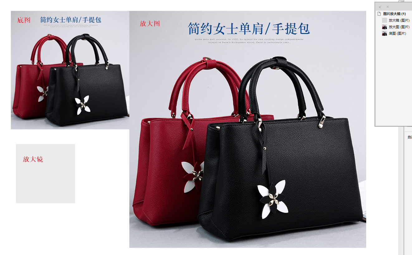 說明:底圖和需要放大的圖片大小根據(jù)自己需要放大的倍數(shù)等比例縮放,放大鏡的大小至少為底圖大小的一半,案例放大倍數(shù) 1 倍,放大的圖片【760×760】,底圖【380×380】,放大鏡【190×190】。
