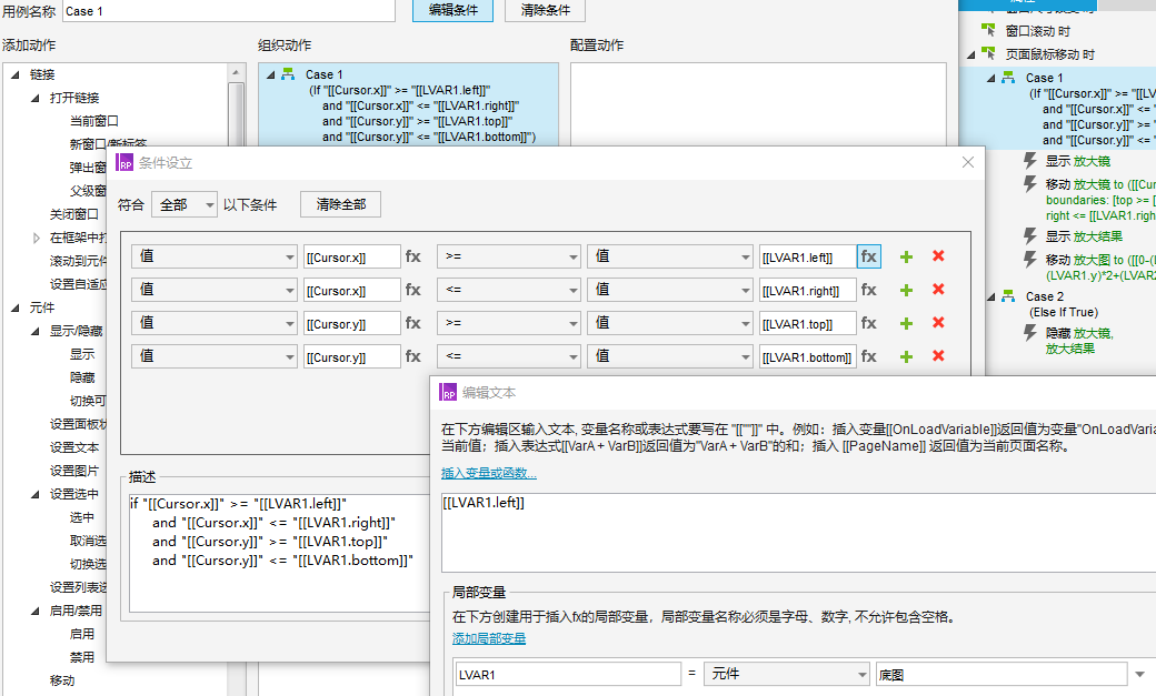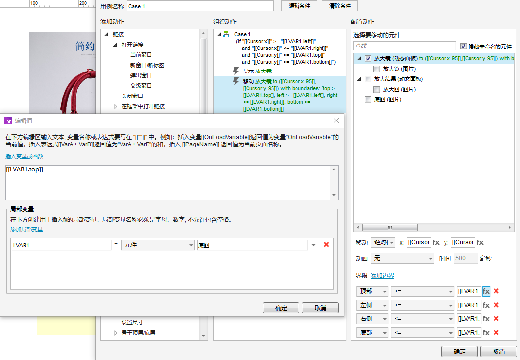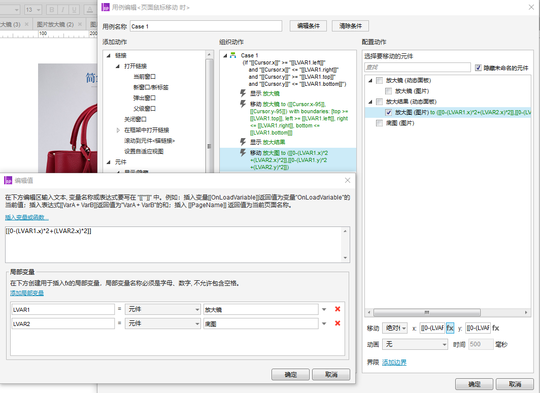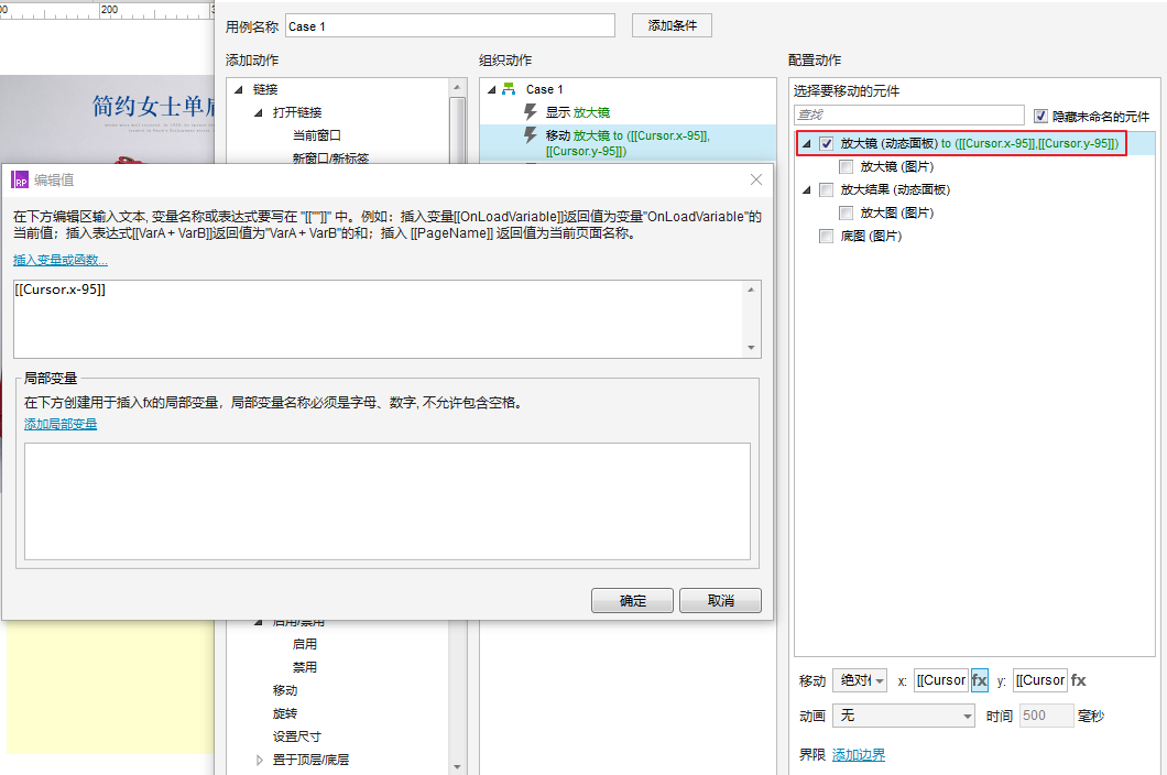 (2)頁面添加【頁面鼠標移動】事件,顯示放大鏡動態(tài)面板,設(shè)置放大鏡的中心點跟隨鼠標移動(放大鏡寬高的一半,分別減去坐標xy),所以插入變量時,設(shè)置為:[[cursor.x-95]]。