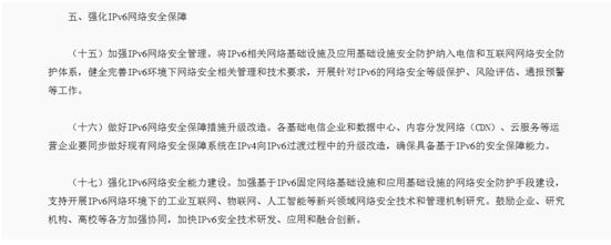 在關(guān)于IPv6規(guī)模部署的行動計劃中,網(wǎng)絡(luò)安全提升是其中的重要任務(wù)。《通知》明確要求從網(wǎng)絡(luò)安全管理、網(wǎng)絡(luò)安全保障措施升級改造、網(wǎng)絡(luò)安全能力建設(shè)三個方面強化IPv6網(wǎng)絡(luò)安全保障: