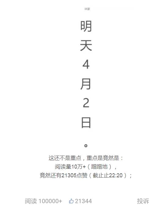 粉絲基數(shù)大的公眾號(hào)追熱點(diǎn)成功率會(huì)比小號(hào)大很多,尤其是過(guò)百萬(wàn)的隨便幾個(gè)字都有10W+轉(zhuǎn)發(fā),這個(gè)不用解釋太多,直接看咪蒙愚人節(jié)的推文吧。