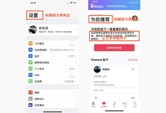 蘋果手機中自帶的軟件(iOS11設(shè)計規(guī)范):在新版本的蘋果手機自帶的軟件中標題都屬于字體放大,界面簡潔的設(shè)計風格。還有蘋果自帶的音樂軟件中,段落中的標題和正文區(qū)別是很明顯的,標題明顯很大,而正文部分相對較小,這就是優(yōu)美簡約原則的體現(xiàn),如下圖: