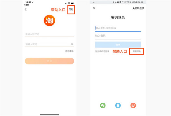 例如淘寶APP和知乎APP登錄頁面的幫助入口:在比較重要的功能入口處有必要提供相應(yīng)的幫助入口,來解決用戶在操作功能過程中遇到的問題或者反饋問題的入口,不要讓用戶在出現(xiàn)問題時手足無措,不知道怎么辦,具體看下圖: