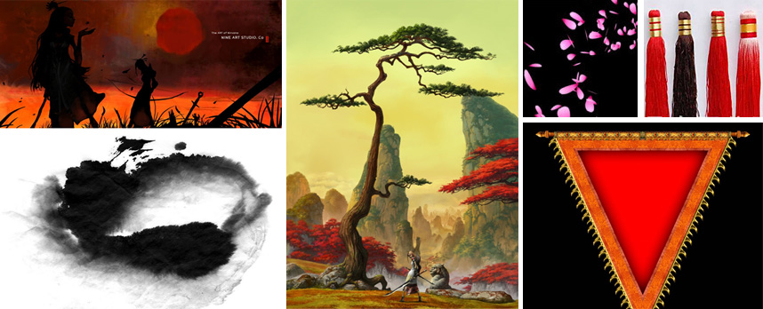 界面主體以水墨與剪影原畫相結合的形式表現(xiàn),體現(xiàn)游戲世界觀,按鈕采用東方古代旗幟的形式,來加強東方元素。